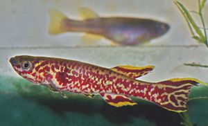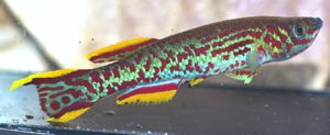 to be 'very variable'. In some gardneri populations their is a common spot or line which can be used as an identifier. With Basua this seems to be in the caudal fin where the red submarginal bands are quite thick. Also in the upper area another red line is present which extends through the length of the fin. |