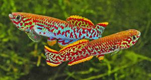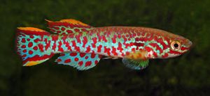 The amount of red spots & there size can be variable. Generally the anal fin has a red bar but the photo below illustrates that they can throw out spots in this fin. Also, a gold form has been around for a number of years. Also, a Nsukka & Lafia (Fp.gardneri gardneri) has a gold form but these have small red spots in the anal fin & no red bar. | |||||||||||||