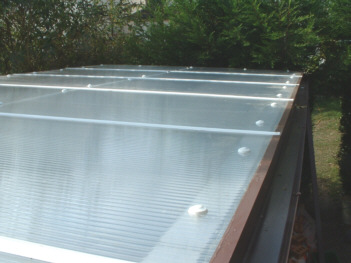 Roof from above showing the 1·05 metre sheets in width held together by rhe glazing bars & held down by screw cap fixings. |