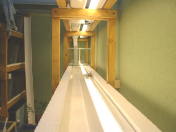 View down the length of the modernised stand with the first tank in place. Note drainage channel to left & lighting to right. A 16" wide stand is tight to cram all this in & I would recommend 18" to be comfortable.