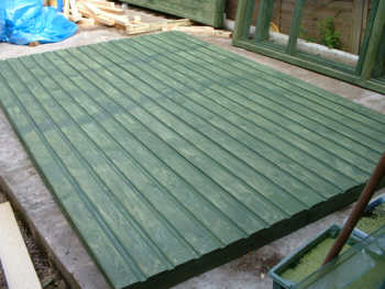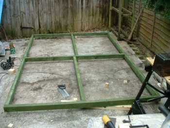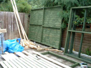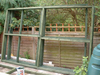 First frame of the back wall, treated with Cuprinol. This is safe with polystyrene. Creosote melts this material. |
