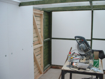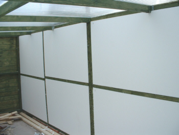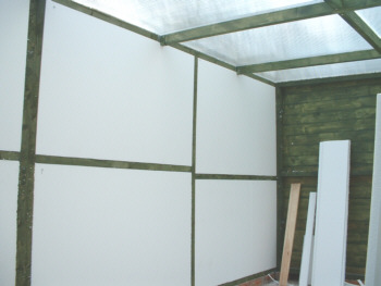 View of finished corner section. Polystyrene is held in place with galvanised nails through zinc washers. The stands will be against the walls & will hold it all together. |