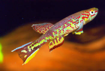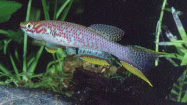 This sp. is a large & colourful Aphyosemion. Perhaps the most striking part is the area behind the pectoral fin which has a number of scales (variable between 5-9 in photo's I've seen) edged in very dark red which gives the appearance of a 'bleeding heart' pattern. Reported to feed exclusively on water insects in the wild (?). At one time A.batesii, A.splendidum & A.kunzi were part of a small group known as the batesii group. Research now believes these sp. to be one & the same so the group has collapsed into one sp. It has been reported (BKA newsletter No.163, March 1979) that differing populations can be sterile (kunzi). |
