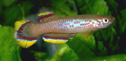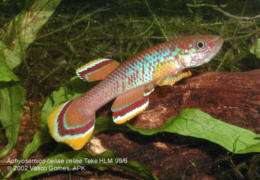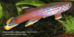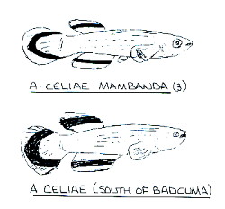 Caudal fin which has an outer marginal crescent all round of yellow with a dark brown sub marginal band sometimes seperated with a band of white.A.celiae winifredae has a wider yellow crescent. The only sp. A.celiae can be confused with is Fundulopanchax cinnamomeum which is a good deal heavier in the body. The