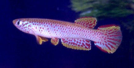 They were first reportedly imported to Belgium in 1951 from Leopoldville. In the UK the first documented import I can find dates back to the summer of 1938 where Fred Wright (a previous BKA Technical Editor) received a pair which had come from Germany that year. (BKA newsletter No.66, February 1971). These were reportedly identical to the 'cognatum' being distributed in 1971. This newsletter contains a b/w photo by Roloff of 'A.schoutedeni'. In 1949 Aquarium Hamburg received a shipment containing this sp. which were identified as 'Aphyosemion singa'. Several years later another import was received which had fewer red spots on the fins & body. This was considered a yellow variation. Basic outlines of these fish with descriptions can be found in the Aquarium Journal April 1962 in an article by Bruce Turner & Albert Klee. First importation into the USA was in the early 1950's. Known to be in the BKA in December 1966 when fish were sent from Australia. No population was given but it was described as being 'a striking little fish, body reflecting blue with a lined pattern of chestnut brown, made up of rows of spots, yellow fins edged at times with a bold pattern of these spots again' (BKA newsletter No.16, December 1966. The BKA had an import described as christyi in October 1974 from Kinshasa. These were said to resemble the photo on page 157 of ROTOW 1. Geoff Wood caught A.christyi in the 1970's at Kinsuka although these fish were distributed as Kinshasa. The true location was 13 km downstream from Kinshasa & about 1 km from the river. These were reportedly very colourful being blue/green in colouration. Later generations seemed to lose the original colouration. This population was only found in one small location. Red markings were found to be variable. In 1986 T.Roberts & L.de Vos collected an Aphyosemion sp. near the Epulu River ferry. The Kinshasa population was originally brought to the UK by Geoff Wood but has since disappeared. Now & again A.christyi Kinshasa is distributed from commercial imports. The collection point should be taken with a 'pinch of salt' as there is no guarantee as to where they were caught. Kinshasa is the airport of departure used for these fish. The photo below of 'Wild Import 1998' was such a collection. These collections show a large blue/purple area between the eye & mid body section. Emmanuel Vreven made collections in the Okapi Faunal Reserve. History of the synonym A.schoutedeni (Boulenger 1920) Boulenger described this