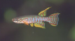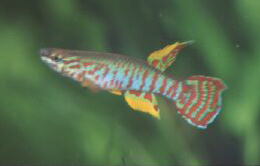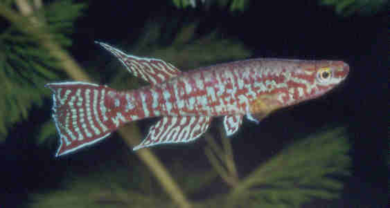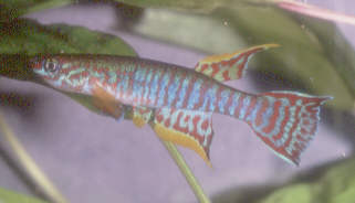 Reports would suggest that breeding is a little more difficult than the easier Aphyosemion species. Some populations are easier than others. I have bred the Mbam, Koupa Matapit, Ntui & Ndop populations in rainwater. Eggs are deposited in floating mops or plants which are taken out & water incubated. These take about 12-14 days to hatch but can go to 20 days. Fry are large enough to take newly hatched brine shrimp as a first food. Growth rate seems very slow & it can take about 8 months for them to reach sexual maturity. Maurice Nicholson reported first signs of sexing out is at 6 months where the vertical lines start to show through, shortly after the caudal fin starts to show colour. He reported that the fish need to be 9 months old before they start to spawn. 25% water changes were done weekly. Stan Langdon kept eggs in preboiled tapwater with a DH of 6-11 & a pH of 7 - 7·5. He had great success in keeping eggs alive. P.Lakermi in BKA newsletter No.278 (October 1988)