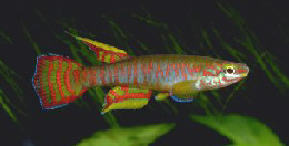 however produced a greater number of fish for distribution. I have found this sp. a little more difficult to spawn & never had more than a few eggs. A dark tank should be used for breeding. Reports suggest that a water change using clean rain water has induced the fish to spawn, although they are not a prolific sp. Eggs are laid mainly in floating mops or vegetation & take 2-3 weeks to hatch. Water incubation is around 10-15 days. Parents are reportedly avid egg eaters (some reports state they are not, & fry go unmolested). Fry can be hard to rear & do best in water from the parents tank which is shallow (2-3"). Fry are small & do best on infusoria for a few days. Water changes should be carried out with extreme caution. Old water would seem to be the key to success with raising this sp. They seemed to dislike harder water of DH10+. Fry are slow to mature & start to sex out in 3-4 months but full sexual maturity is not attained until they reach around 8 months.. In BKA newsletter No.70, June 1971 a dark breeding tank was used with a layer of peat on the base & floating plants. A handful of rotting sphragnum moss was also added. Water temperature 72-74° F, pH 6·6-6·8, DH 2-7. Collecting eggs from mops was not successful as they turned fungussed. It was found more successful to breed them in a natural setup & let fry hatch in the parents tank. One report in BKA newsletter