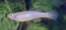 A stocky fish. Males have heavy red lines on the head. The body shows spots in the front half & vertical lines in the rear half which vary in intensity between populations. | ||||||||||||||||||||||||||||||