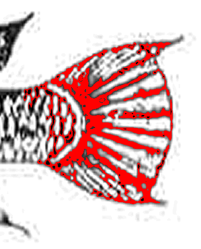 Boulenger's description in Freshwater Fishes of Africa gives the following information on colouration:- 'Male olive above, yellowish beneath, with numerous, rather large carmine spots disposed irregularly; dorsal fin with small round purple spots; anal and caudal with large purple markings, which may form streaks in the direction of the rays'. Boulenger is basically saying that the caudal is flamed or flare patterned similar to that found in A.pyrophore for example. I would envisage the purple spots to be red as too the flare pattern in the caudal fin. I would consider the preserving agent may have tainted the red colouration.