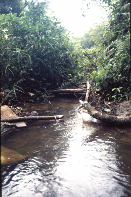 A brook which feeds the Douano River subsystem (Nyanga), close to Banyanga in the Mayumbe Mountains rainforest (altitude 250m). JH 76 / 27. |