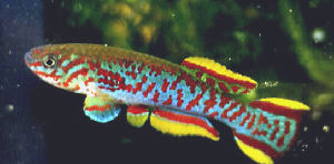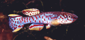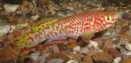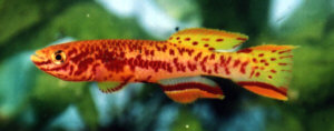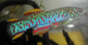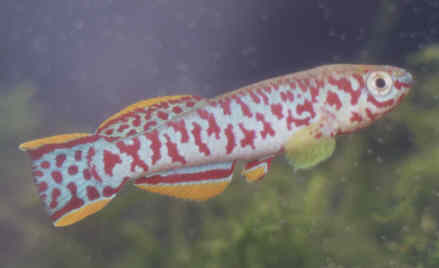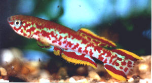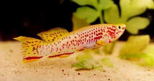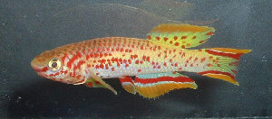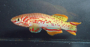 The amount of red spots & there size can be variable. Generally the anal fin has a red bar but the photo below illustrates that they can throw out spots in this fin. Also, a gold form has been around for a number of years. Also, a Nsukka & Lafia (Fp.gardneri gardneri) has a gold form but these have small red spots in the anal fin & no red bar. | |||||||||||||