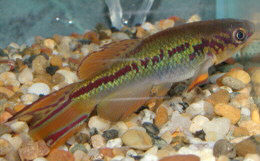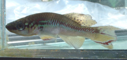 Odieke - Orashi River, southern Nigeria. Collected by Uyi & Otufu in 1991. Rumuokwuta - Near Port Harcourt. Collected by Powell in 1980. Yellow gularis - Described by Arnold in 1934. A broad median line extending into the caudal fin. Irregularly spotted rounded dorsal fin. Anal fin rounded with irregularly spotted with a broad red submargin. Caudal trilobate with bands of contrasting colours. Pectoral fins pointed.