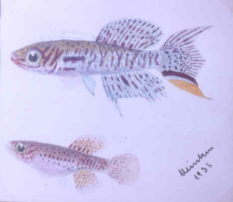 Meinken's 1933 watercolour painting of fish from the type locality. Note the flared pattern to the upper & mid sections of the caudal fin. This form was maintained in aquaria through WWII by Walter Berthold who lost them all through a heater problem. Roloff took a photo of this form in the '30's. |