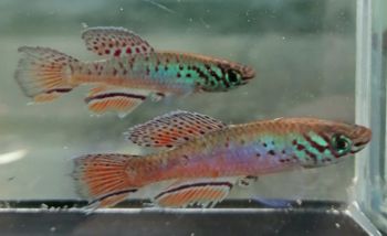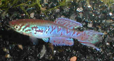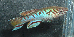 but had a more or less complete outer marginal band in the anal fin. A. fish called Aphyosemion ruwenzori appeared in Germany around 1965 but was regarded as a misnomer of filamentosum & the name became a synonym of filamentosum. These were also called 'the orange tailed filamentosum'. The orange only appears in young males & gradually fades as they mature. Ruwenzori is a mountain range in East Africa. Much of the above work comes from letters & personal comments from 'Willi' Harvey, a former Technical Editor of the BKA & much respected Killie keeper. In an article by Bruce Turner in the Aquarium Journal of October 1961 reference is made to using dark females (he noticed 2 shading variants in batches of fish) for breeding. These produced better quality fish than using the lighter form A population from Ouidah was sent from Africa to Dan Katz (AKA) in 2000. |