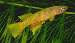 The golden yellow colouration is nore brighter in wild caught fish. Tank raised fish do not seem as bright although the colour is retained in the un-paired fins. Sides of aquarium raised fish have a purple/blue colouration. Under good conditions the body has a brown/yellow sheen. This sp. seems particularly susceptible to velvet so the tank must be kept clean & clear of un-eaten food left to decay. Regular water changes are required. |