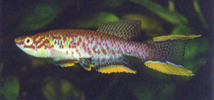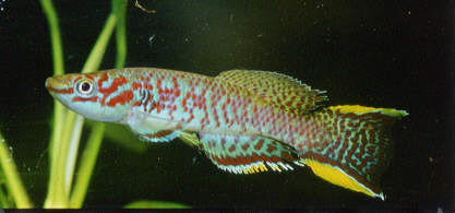 This sp. is a large & colourful Aphyosemion. Perhaps the most striking part is the area behind the pectoral fin which has a number of scales (variable between 5-9 in photo's I've seen) edged in very dark red which gives the appearance of a 'bleeding heart' pattern. Reported to feed exclusively on water insects in the wild (?). At one time A.batesii, A.splendidum & A.kunzi were part of a small group known as the batesii group. Research now believes these sp. to be one & the same so the group has collapsed into one sp. It has been reported (BKA newsletter No.163, March 1979) that differing populations can be sterile (kunzi). |