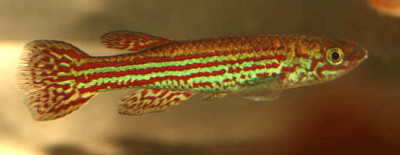 red lines & spots on body & all unpaired fins on males. Females have 4 grey/brown lines running horizontally along the body. The bottom line consists of a row of 4-5 reddish dots. |