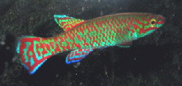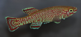 A stocky fish. Males have heavy red lines on the head. The body shows spots in the front half & vertical lines in the rear half which vary in intensity between populations. | ||||||||||||||||||||||||||||||